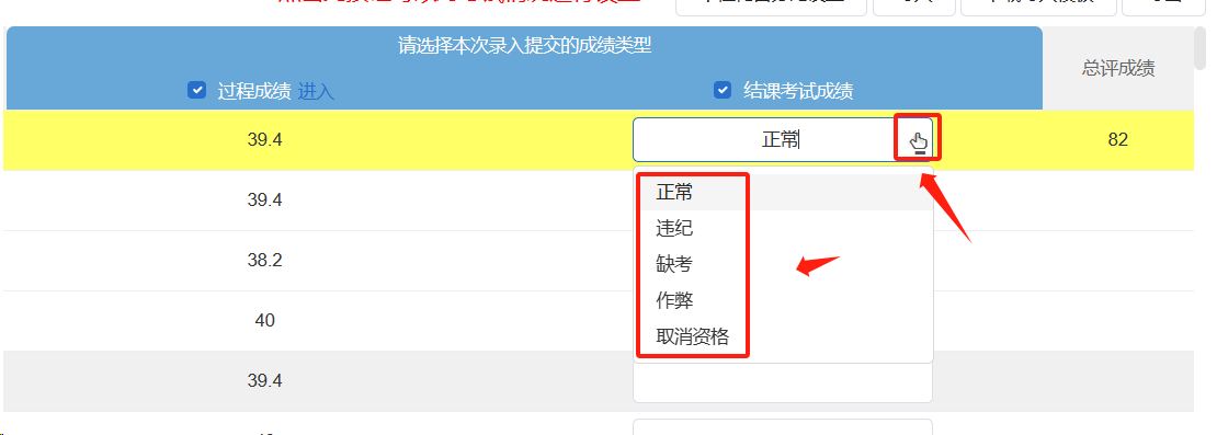 点击录入框的右侧按钮,可以选择非正常的考试情况,例如缓考、旷考等。(在系统中缓考申请成功的学生,结课考试成绩会自动更新为“缓考”状态)