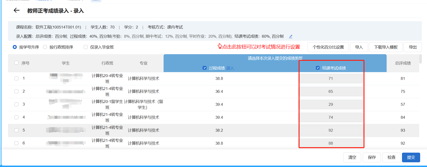4.总评成绩录入:点击成绩比例配置页面的【开始录入】或者过程成绩提交后的【综合成绩录入】都可进入到总评成绩录入页面。