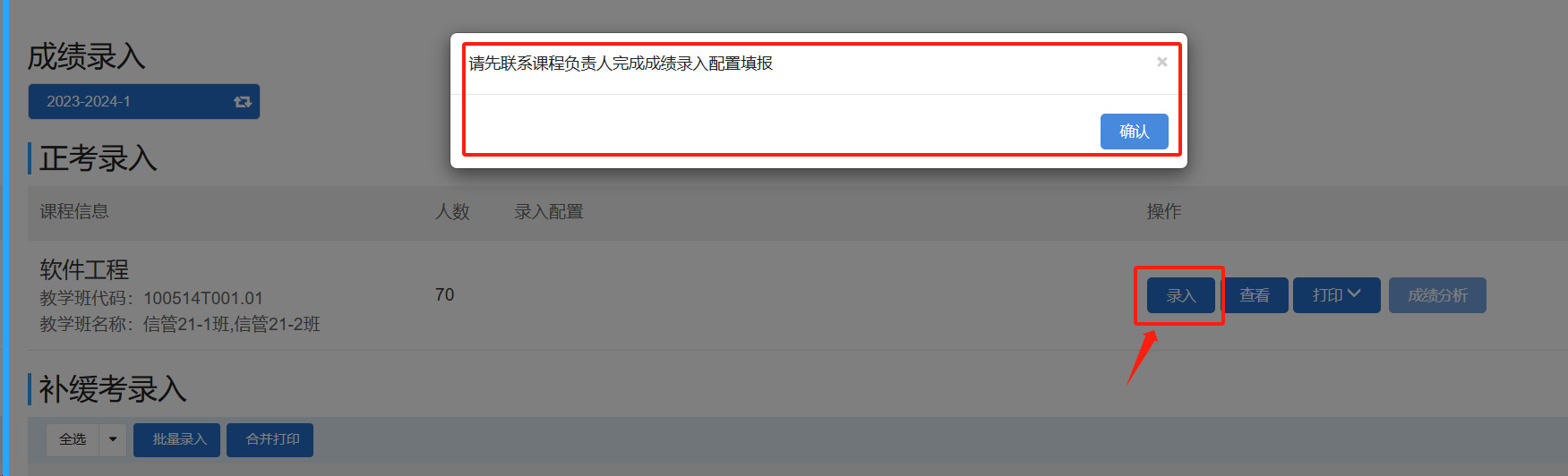 1. 进入功能后,点击要录入成绩的教学任务后的按钮进入到成绩录入页面。若课程负责人未填报成绩录入配置,系统会给出如下提示:请先联系课程负责人完成成绩录入配置填报。