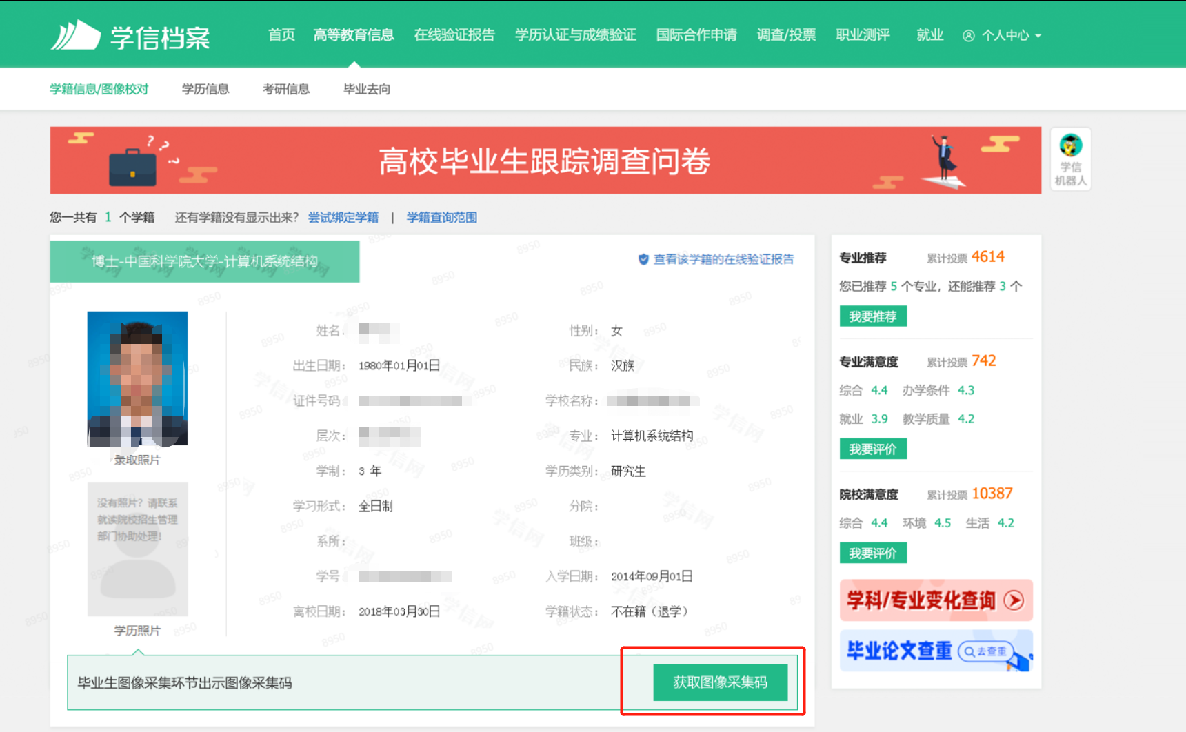 获取采集码时请同时核对学信网中个人信息,若个人身份信息存在不一致的情况请与教务处联系(010-89739131)。