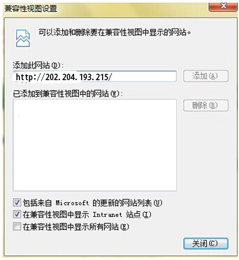 二、如使用IE11以上浏览器,请先在浏览器“工具”菜单中,找到“兼容性视图设置”(如下图)在“添加此网站”中添加网址“http://202.204.193.215/”,确定关闭即可。
