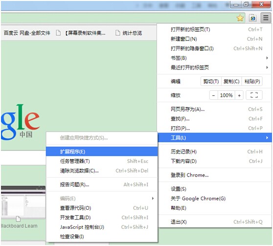 打开谷歌浏览器,点击右上角“三横”的图标,找到工具-扩展程序