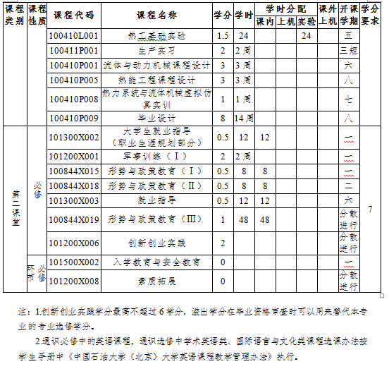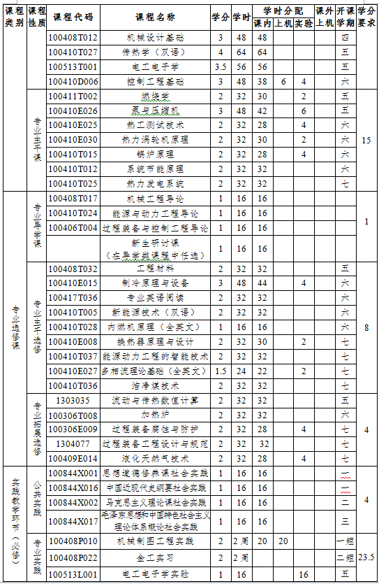 机械制图、理论力学、材料力学、机械设计基础、电工电子学、工程热力学、流体力学、传热学、燃烧学、控制工程基础、泵与压缩机、热力涡轮机原理、锅炉原理、热工测试技术、热力发电系统、系统节能原理。
