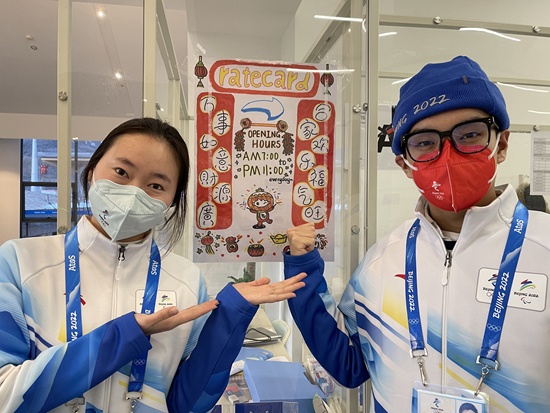 李茂粟工作的地点是收费卡服务台,志愿者们每天都要面对来自各地的运动员。为了方便刚到冬奥村的代表团了解服务台的工作时间,李茂粟谋划着做个海报贴在窗口。因为正值新年,他觉得索性加入春节的元素,既有实用价值,还能兼具“传递中国传统文化”的作用。