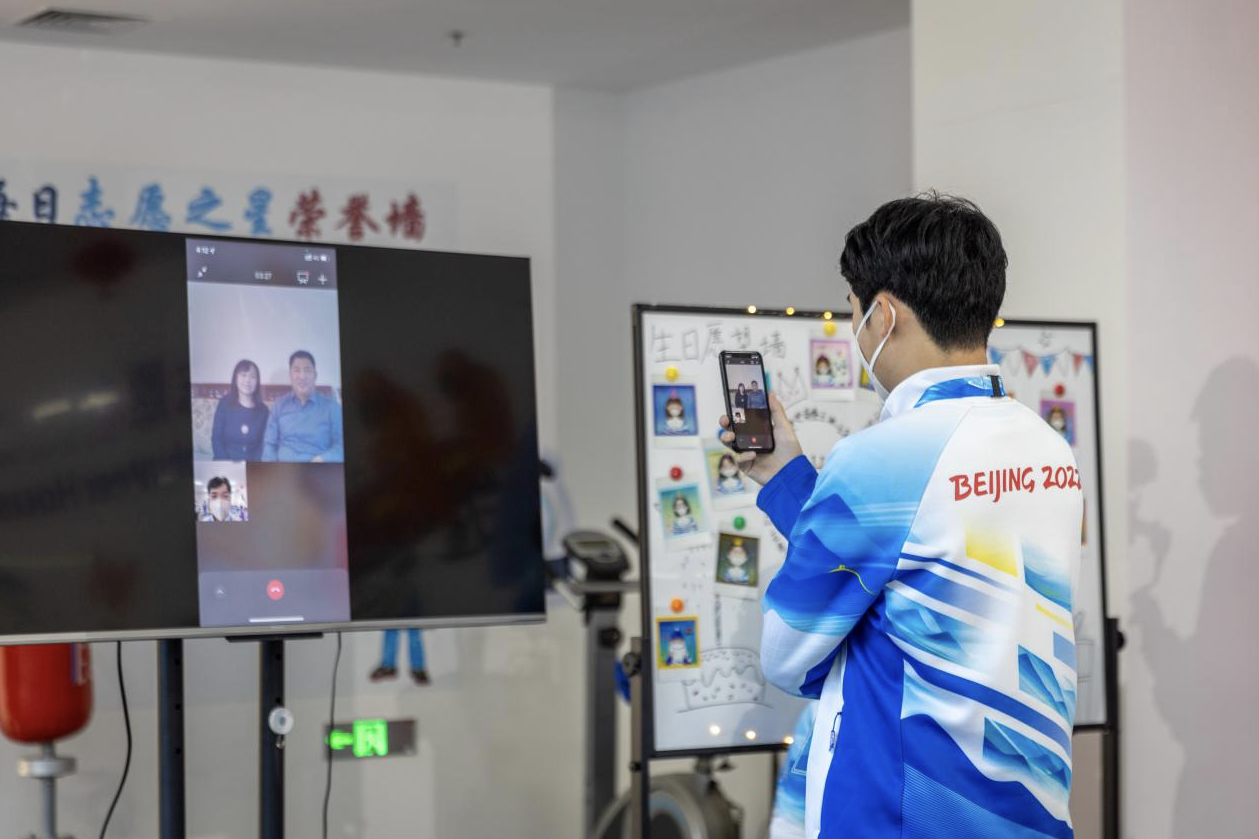 生日会上还有一个特殊的环节。前期,志愿者团队了解到,志愿者闫宏伟的父亲阎斌是2008年北京冬奥会鸟巢外立面的光照设计师,在集体生日会现场,连接“两代奥运人”的视频连线开启。