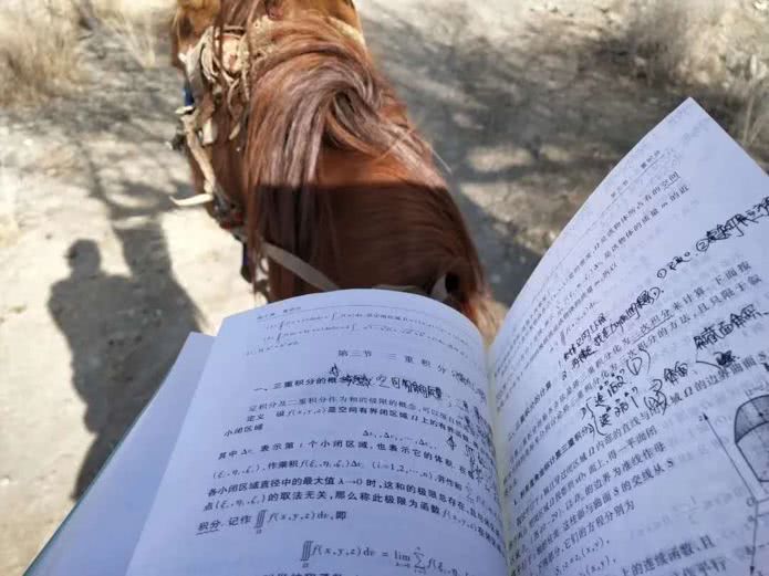 这是中国天天色天天(北京)地球物理学院学生下力肯·对山汗的一张“自拍照”,照片中,他只有一个骑在马背上的影子,占了画面一半的是他的高等数学课本。