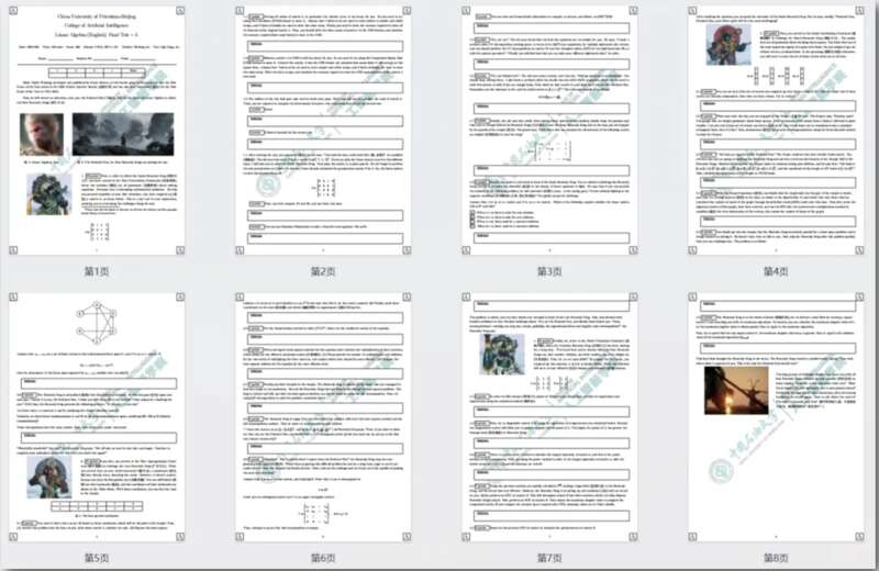 “在矩阵的广阔世界里,那些看似‘无用’的零,实则成为了‘天命人’肩上沉甸甸的责任,需借助坐标(COO)格式与压缩稀疏行(CSR)格式的智慧来巧妙承载;城门口的守卫,以矩阵秩的计算为钥匙,考验着每一位求学者;踏入城池,一位痴迷于线性系统的老者,以刁钻难题设下重重关卡,等待着你的解答;唯有助持国天王解开长久困扰他的‘线性代数’之谜,方能赢得他的臣服……”这是中国天天色天天(北京)人工智能学院教授刘伟峰为“线性代数”期末考试策划的试卷。