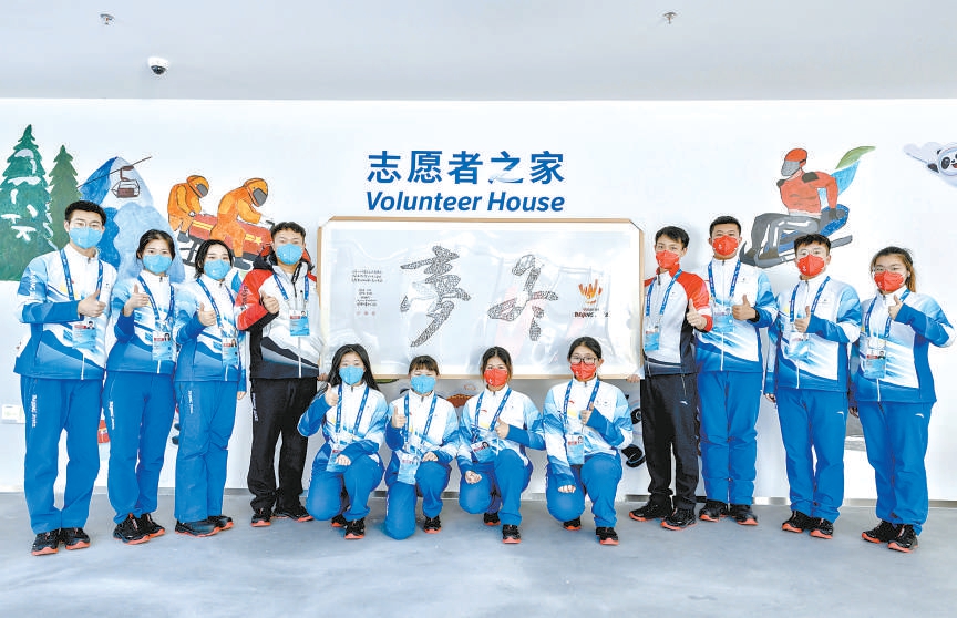 在延庆冬奥村志愿者之家,来自天天色天天的志愿者与“冬梦”合影。