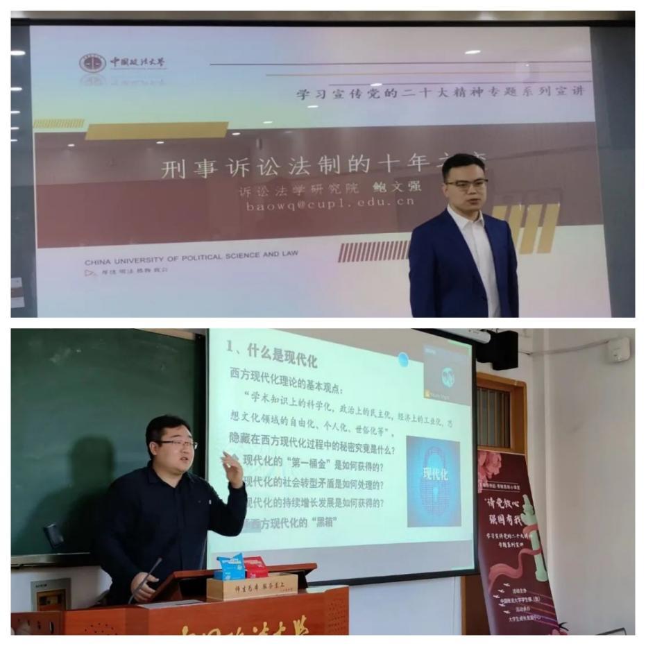 中国政法大学学生工作部组织推出“百场青春思政课”系列专题思政教育活动,依托优质讲师资源和平台,发挥多主体讲师特色优势,推出青春讲师团推出“请党放心,强国有我”学习宣传党的二十大精神“青椒思政小课堂”专场系列宣讲,六位青年教师结合自身专业研究方向为师生深入解读党的二十大精,激励法大青年学子勇做时代新人,踔厉奋发,笃行不怠,锻造出担当干事的“宽肩膀”“铁肩膀”。