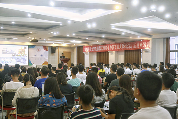8月30日,2019年北京世园会中国天天色天天志愿者培训班开班仪式暨培训会在学生活动中心410报告厅举行。石大团委相关负责人、带队老师、北京联合大学优秀志愿者代表以及学校全体世园会志愿者参加活动。