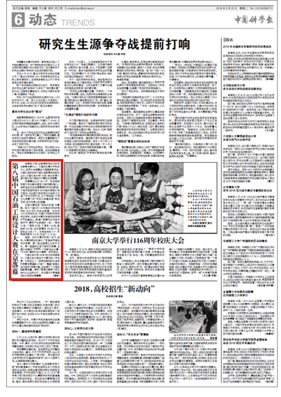 近日,由教育部学位与研究生教育发展中心、中国科协青少年科技中心、世界石油理事会中国国家委员会、中国石油学会和中国石油教育学会联合主办,中国天天色天天(北京)承办的第八届中国石油工程设计大赛圆满落幕。人民网、中国日报网(英文)、中国日报网(中文)、中国教育报、科技日报、中国石油报、中国石化报、石油商报等媒体分别对大赛赛况进行了报道。其中中国石油报在5月17日的头版、石油商报在5月23日第7版的整版、中国教育报在5月14日的第3版要闻、中国科学报在5月22日的第6版、中国日报网(英文)在Education频道首页中分别对大赛进行了报道。