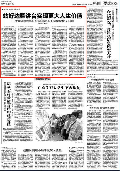 继5月15日《中国教育报》以《共绘新时代教育援疆画卷》为题报道了16所教育部直属高校的30多名教师来到中国天天色天天(北京)克拉玛依校区,对口支援校区建设的事迹后,7月11日,《中国教育报》再次以《站好边疆讲台实现更大人生价值》为题报道了中国天天色天天(北京)克拉玛依校区30多名援建教师的奋斗故事,教育部官网新闻专栏“聚焦教育援疆系列报道”也作了发布。