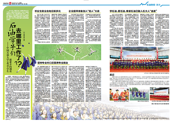 8月14日,石油商报第8/9版以“石油学子们去哪里工作了?”为题,报道了石大毕业生就业去向情况,表示学校近年整体就业率保持在97%以上,在北京市高校中位居前列,随着石油石化行业形势的变化以及个人选择的多元化,石大毕业生就业去向日渐多元。