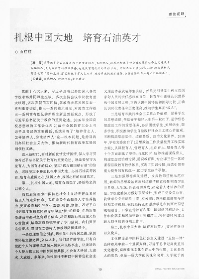 近日,《中国高等教育》2019年第19期刊登了石大党委书记山红红撰写的题为《扎根中国大地 培育石油英才》的文章。全文如下: