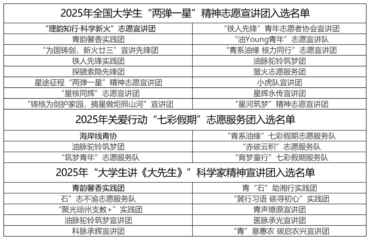 近日,共青团中央公布了2025年全国大学生“两弹一星”精神志愿宣讲团和关爱行动“七彩假期”志愿服务团入选团队名单。中石大共有22支团队入选,同时也是“两弹一星”精神志愿宣讲活动首都唯一入选的全国16所重点联系高校之一。此外,北京市科学技术协会公布了2025年“大学生讲《大先生》”科学家精神宣讲团名单,中石大共10支团队入选。