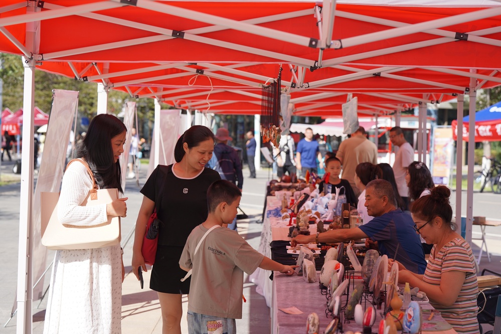 在“求是”路上,新生及家长们在克拉玛依非遗活动展区近距离体验紫砂哨埙、金丝玉雕、扎染、石头画等非遗技艺,感受克拉玛依深厚的文化底蕴与匠心传承。非遗传承人指尖翻飞,将紫砂揉捏、塑形;一旁的金丝玉雕更显精致,玉石的温润与金丝的璀璨交相辉映;扎染体验区充满乐趣,白色棉布浸泡、捆扎,浸入染缸——原本单调的白布上绽放出深浅不一、纹路独特的蓝白花纹;戈壁鹅卵石经过画笔勾勒,成为绘有新疆风情的艺术品。“这是我第一次如此近距离地接触非物质文化遗产,每一样都让我觉得特别新奇。感谢克拉玛依市和中石大,把这么优质的文化资源带到我们身边。”中石大克拉玛依校区资源勘查工程专业2025级本科新生许晓军表示。