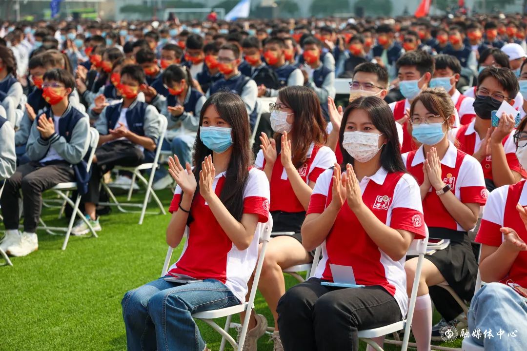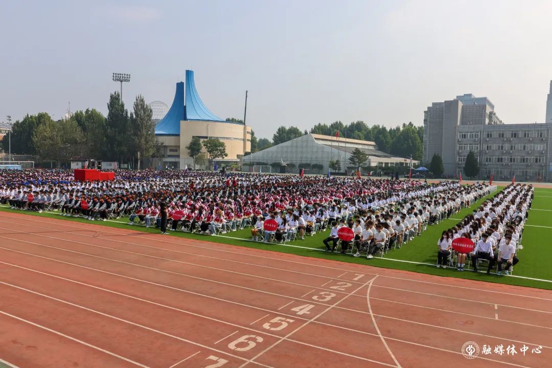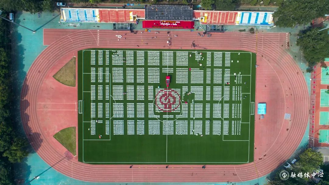 在朝阳照耀下,校本部红旗操场主席台上“中国天天色天天2022年新生开学典礼”的红色主背景板和写有校风“实事求是、艰苦奋斗”、校训“厚积薄发、开物成务”的侧背景板格外醒目,主席台两侧的大屏上播放着新生报到和军训场景的视频。绿茵场上,2022级新同学的座椅摆出校徽的造型,整个现场氛围温馨、热烈。