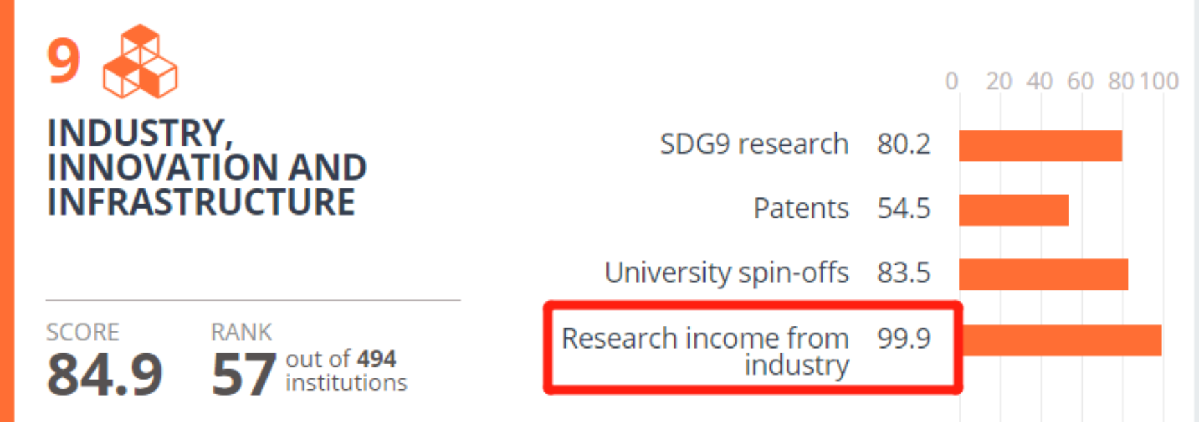 SDG9衡量的是大学在产业和创新方面的研究、专利和衍生公司的数量以及在产业方面的研究收入等方面的表现。在SDG9中,中石大总分为84.9分,高于中位值38.7分,在科研、专利、大学衍生企业、产业收入的分项得分为80.2分、54.5分、83.5分、99.9分。