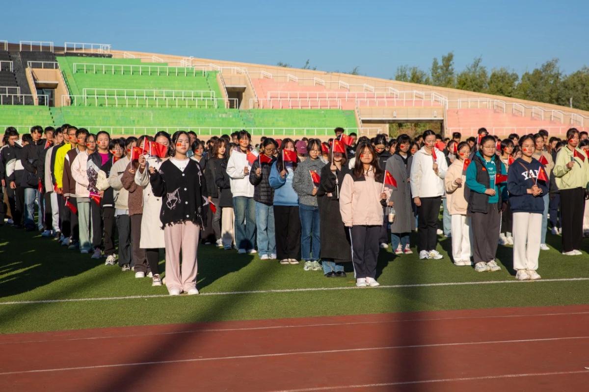 克拉玛依校区也在红旗操场举行了国庆升旗仪式,全体在校新生和辅导员参加活动,高唱雄壮的国歌旋律,诵读爱国诗篇《我的祖国》,活动现场涌动着澎湃的爱国热情。
