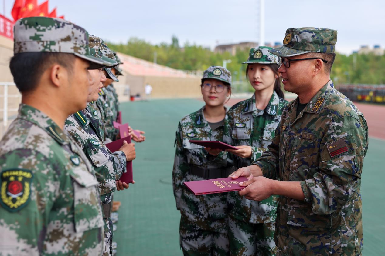 克拉玛依校区党委副书记徐长亮宣读了2025级本科生军训团表彰决定,8个先进集体、39名军训教官、89名军事训练标兵和122名作风纪律标兵获得嘉奖。武警某部中校参谋长徐永康为优秀承训教官代表颁发荣誉证书,克拉玛依校区副校长、总会计师张红艳为参训学生标兵代表颁发荣誉证书。