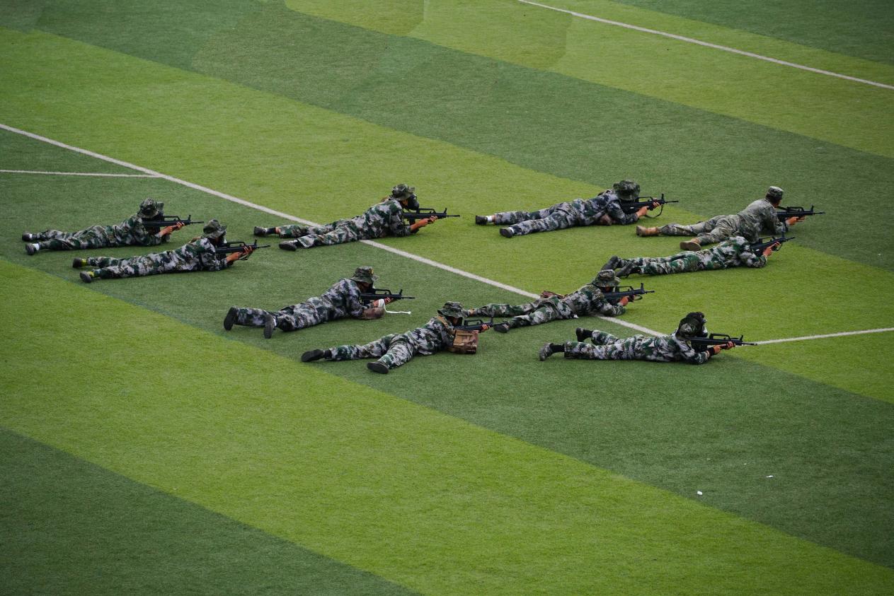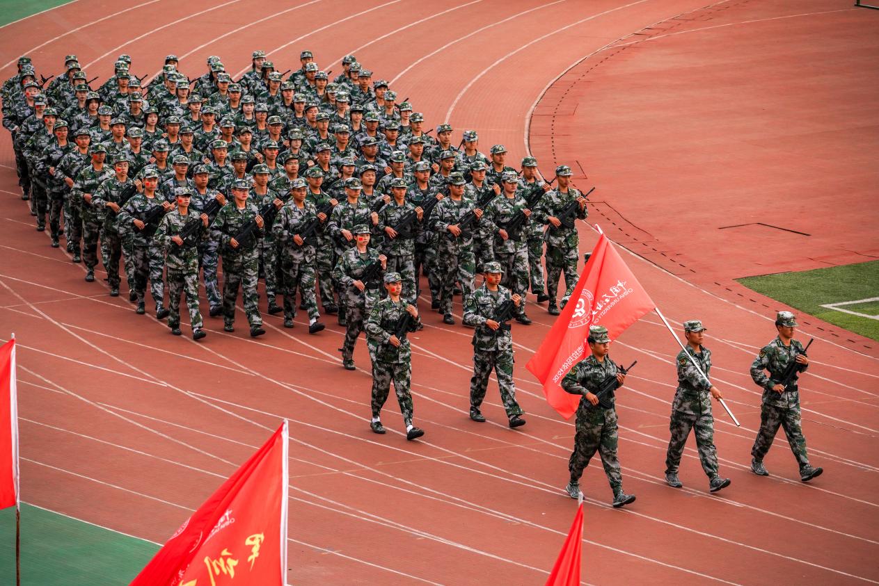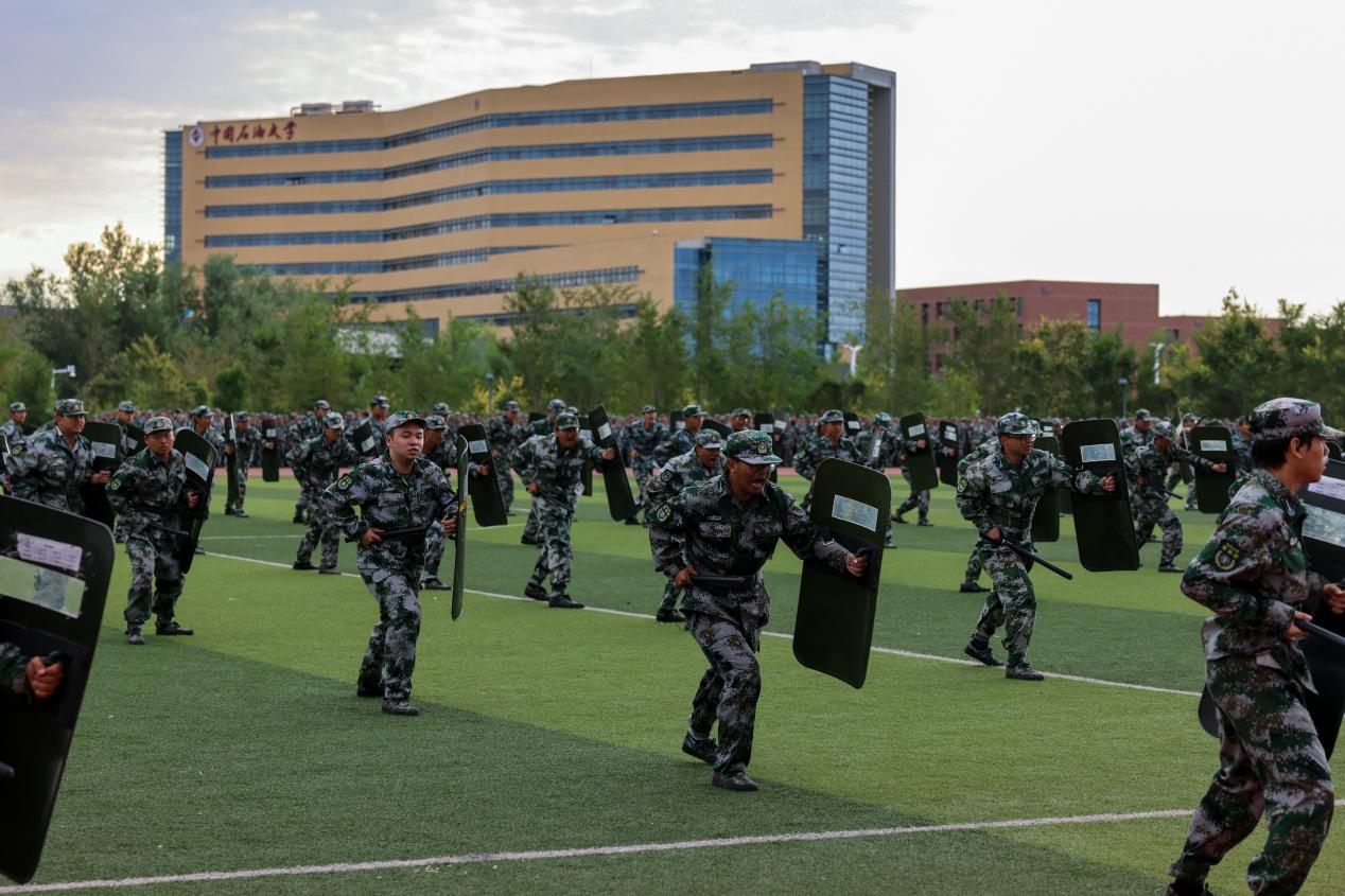 2025级新生进行了一场精彩的军训汇报表演。表演中,他们展示了在军训期间学到的各种军事技能和战术动作,包括擒敌拳、刺杀操、警棍盾牌术、综合战术演练等科目,展现出中石大青年爱国爱校、奋发有为的坚定决心。