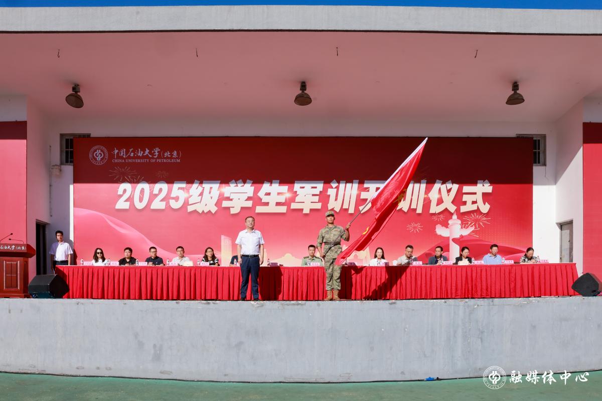 黄磊向军训团授团旗并向承训部队官兵表示感谢,他表示,军训作为大学生活的“第一堂必修课”,不仅是国防教育与军事技能的传授,更是爱国主义教育、集体主义精神培育、纪律观念树立的重要载体,希望全体学生认真学习习近平总书记在纪念中国人民抗日战争暨世界反法西斯战争胜利80周年大会上的重要讲话精神,继承和发扬伟大抗战精神,厚植“能源报国”家国情怀,弘扬“铁人精神”红色基因,在严格的训练中不怕苦、不服输,不断夯实成长成才根基,磨练吃苦耐劳的品质,增强团队协作意识,用实际行动诠释中石大学子能源报国的责任与荣光。