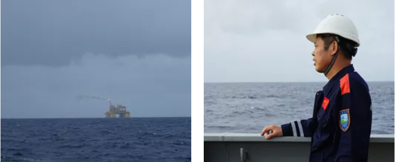 杨进扶舷远眺“深海一号”