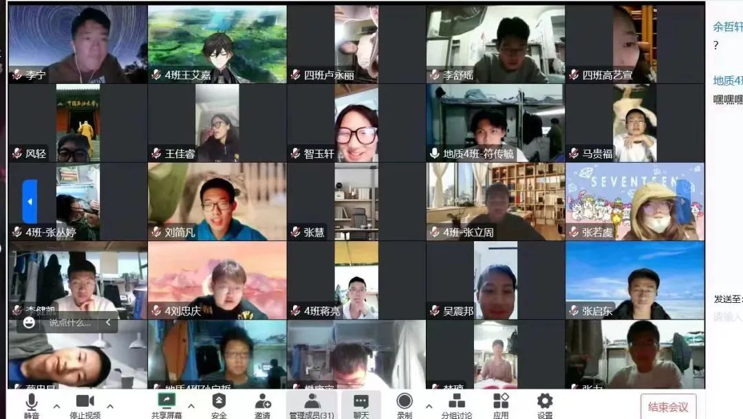 地质类2022级的大一新生们还进行线上集体晚自习,班委督促,打卡签到,开展主题班会,邀请学业优秀的同学分享经验,及时提醒同学们上课。国际教育学院的留学生们也开展线上集体自习。