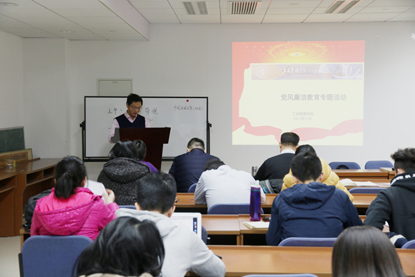 12月11日上午,石大工商管理学院在主楼B1118会议室开展党风廉政专题教育活动,工商管理学院党委书记殷建平,院长郭海涛,党委副书记罗晓燕,副院长沈庆宁、马春爱,以及师生代表参加活动。