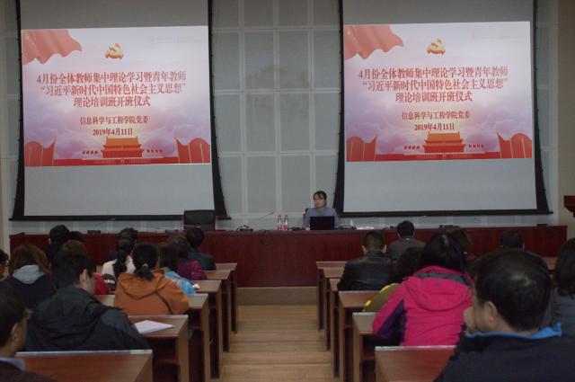 4月11日,石大信息科学与工程学院举办2019年青年教师习近平新时代中国特色社会主义思想理论培训班开班仪式暨4月份全体教师集中理论学习。马克思主义学院副院长张明明应邀主讲,信息学院全体教职工60余人参加活动,活动由信息学院党委副书记董艳军主持。