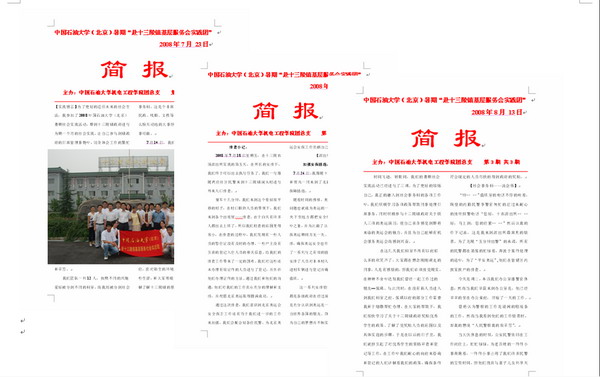 实践成员分配在镇政府不同的科室,不仅协助政府工作人员的奥运宣传、人大补选和社会事务等工作,还积极投身到铁人三项比赛演练的外围保障安保服务中。宣教中心的四位实习同学,冒着炎炎烈日,在十三陵镇各村进行“关于十三陵镇村民文化素质的提高”的调研,并为十三陵镇的发展和村民素质的提高提出了可行性建议,受到领导一致好评。实践期间,实践团队高质量、高效率的完成了领导交给的各项工作任务,充分发扬了石大学子“特别能吃苦 特别能战斗”的铁人精神,得到了镇政府一致肯定和高度赞扬。此外,实践团主动把此次的经历和感受通过简报的方式展现出来。