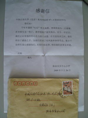 昨日,收到陈家坝中心小学的感谢信,机电研07-4党支部的全体成员为能够给灾区的重建工作贡献微薄之力而倍感欣喜。礼物虽小,但展示了新时代大学生的社会责任感。