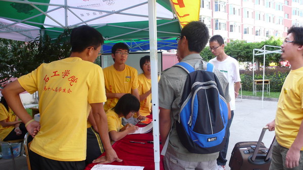 迎新的志愿者引导着新生办理入学手续,为陪同前来的家长端茶递水,为前来咨询的人详细的进行解答,帮助新生把行李送回宿舍,他们为家长们准备了遮阳伞,并在展板上写上天气预报……