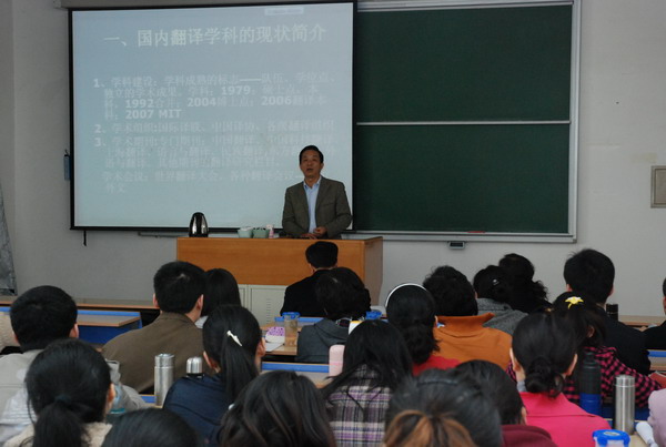下午3:30,文军教授在三教203为外语系师生做了题为《国内翻译学科现状及研究中的几个问题》的学术报告。文军教授首先介绍了国内翻译学科的发展及现状,并对学科建设等进行了系统的阐述。随后,文教授就论文的创新、问题意识及区别性特征等问题做了进一步的探讨。在问答环节,老师和同学们就翻译方向及具体定位、翻译水平如何突破等问题咨询了文教授。文军教授的讲座内容科学专业,为与会听众提供了大量翻译学界的最新信息数据,使师生们对翻译学科的发展趋势有了系统的了解。