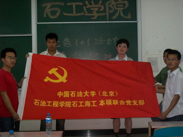 梁永图向联合党支部授旗并宣布石工海工本硕联合党支部正式成立,同时提出了几点希望:希望联合党支部能够充分发挥作用,群策群力将红色“1+1”活动做好,同时带动更多的同学参与到活动中,让同学们懂得奉献爱心,帮助他人,希望大学生能积极到基层就业,参与社区服务工作,最后希望各位同学能够合理安排好时间,在保证学习的前提下,安全开展活动。