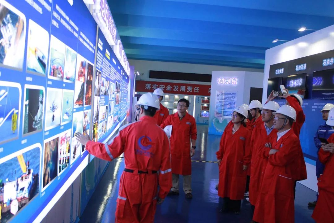 双方代表赴海洋石油培训中心开展参观学习。在井控中心展览馆,了解海洋石油工业重大事故,尤其是海洋平台发生井喷失控事故处置情况,学习中海油井控风险管控措施,了解了一系列平台救援装备。在模拟钻井施工现场,党支部成员登上钻井平台和司钻间学习井架结构,了解一线作业现场的工作情况。