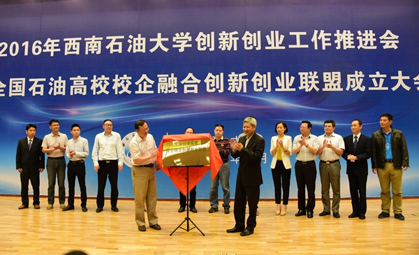 雷玉江与原四川省政协副主席陈次昌共同为全国石油高校校企融合创新创业联盟揭牌。联盟的成立搭建了学校与政府、企业、兄弟高校协同育人的平台,是石油高校加强联系、深度融入石油行业和地方经济社会发展的一个新尝试,将在更大范围、更高层次、更深程度上推进创新创业工作。