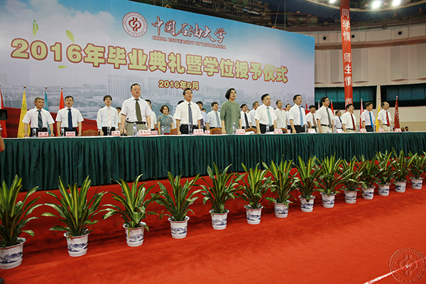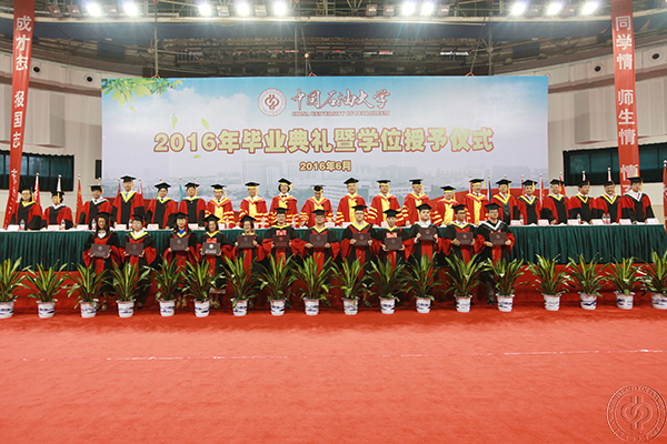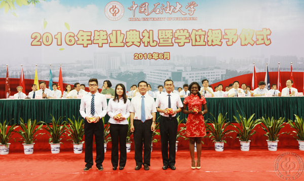 2016届石大毕业生中共有1873名毕业生获得学士学位,148名毕业生获得双学士学位,1885名毕业生获得硕士学位,118名毕业生获得博士学位。党委书记蒋庆哲为毕业生代表颁发了纪念品。