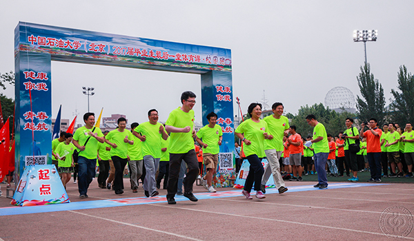 为营造重视体育、参与体育、享受体育的校园体育文化氛围,倡导文明离校,健康毕业,祝福毕业生带着母校的期盼走向人生新的旅途,6月5日,石大体育运动委员会、体育教学部、学生工作处、团委共同举办了2017年毕业生最后一堂体育课——首届毕业生校园跑活动。党委书记山红红、副校长徐春明,教务处、学生工作处、团委以及各院部负责人参加了活动。
