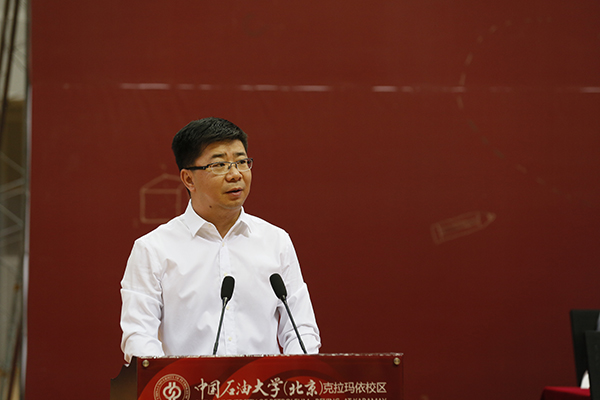 陈新发代表新疆油田公司欢迎同学们来到油城克拉玛依,表示克拉玛依校区将是同学们实现人生梦想的广阔平台,新疆油田公司将继续发挥自身优势,全力支持克拉玛依校区建设,希望同学们牢记习近平总书记对青年的嘱托,坚定“我为祖国献石油”的初心,珍惜来之不易的学习机会,放飞青春梦想,积累人生能量,打好承担祖国石油工业未来希望的知识基础、能力基础和智力基础。