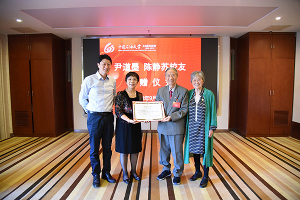 党委书记山红红向尹道墨、陈静苏夫妇颁发捐赠证书