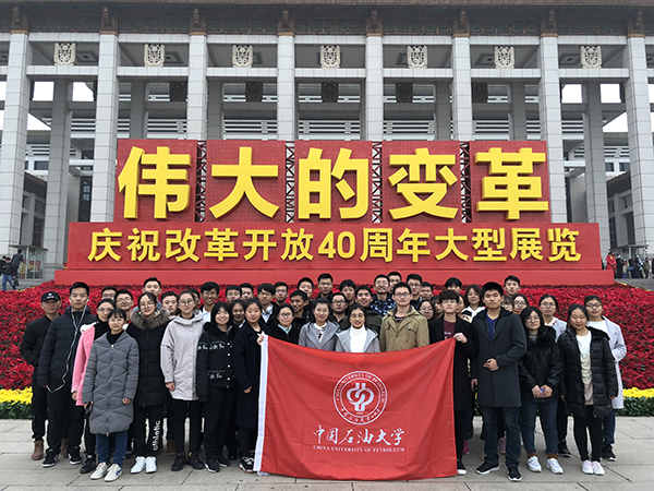 在讲解员带领下,师生们依次参观了6个主题展区。安徽小岗村18位农民按下包产到户“红手印”的雕塑,长征系列运载火箭、“天宫号”空间站等的模型,北京城市副中心、雄安新区总体空间格局和城市规划蓝图的沙盘……特别是展览中不时出现的“石油元素”——海洋石油钻井平台、陆上油气大型压裂车组、“一带一路”能源合作项目等等,不时吸引师生驻足,凝神观看展品,热切交流感想,直观地感受到了改革开放40年来,在中国共产党领导下中国人民用双手书写的国家和民族发展的壮丽史诗。