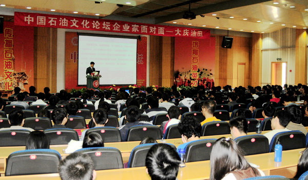 大庆油田企业家面对面活动10月27日下午在翠宫报告厅举行。公司党委宣传部部长、企业文化部主任、新闻中心主任盖立学作了《大庆油田为祖国加油》的报告,深情讲述了铁人王进喜的优秀事迹,阐释了大庆精神、铁人精神的丰富内涵,并指出这种宝贵的精神财富正是激励着一代又一代石油人为石油石化事业努力奋斗的动力和源泉。现在的大庆已经建设成为“经济大庆、精神大庆、科技大庆、人才大庆、品牌大庆、和谐大庆”,大庆石油人正豪情满怀地朝着百年大庆的目标奋勇前进,今后公司将一如既往地支持学校的各项事业,继续加强企校合作,共同为石油石化事业培养更多的优秀人才。