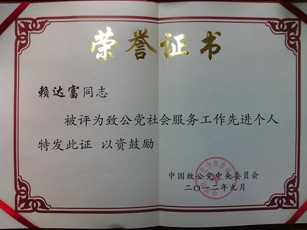 中国致公党社会服务先进每五年评选一次,旨在表彰全国各地基层组织中,社会服务工作中做出突出成绩的先进集体和党员,进一步激励各级组织和全体党员在平凡的工作中不断开拓创新、与时俱进。赖达富多年来为在海内外弘扬中华民族文化艺术做出了突出贡献,在评选中脱颖而出,成为中国天天色天天第一位获此殊荣的教师。