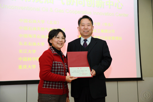 中国天天色天天(华东)校长山红红为“非常规油气协同创新中心”主任高德利教授颁发聘书
