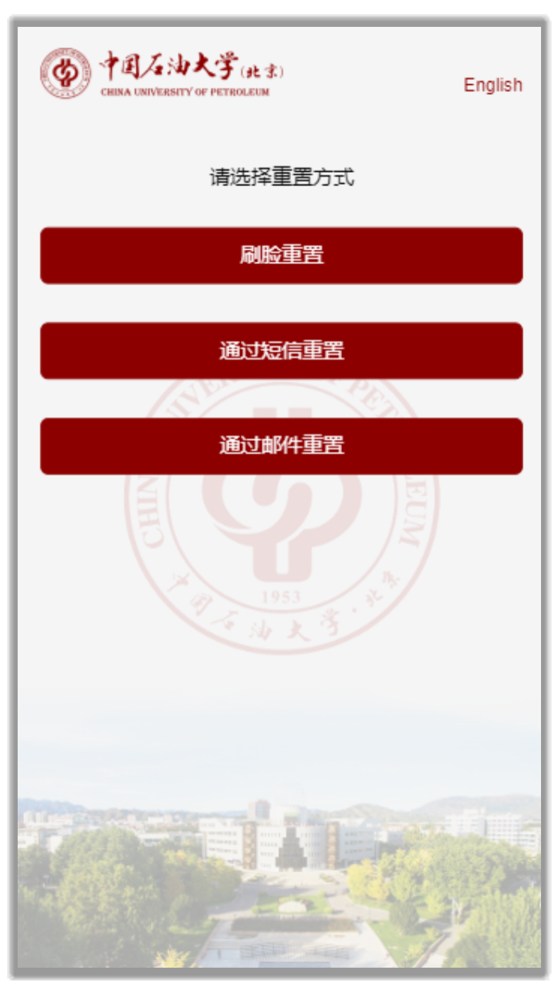 1、输入学号/工号,点击下一步,系统会列出三种密码重置的方式:刷脸重置、通过短信重置、通过邮件重置。根据您在统一认证系统中的信息完整性不同,可选择方式对应的按钮会亮起。