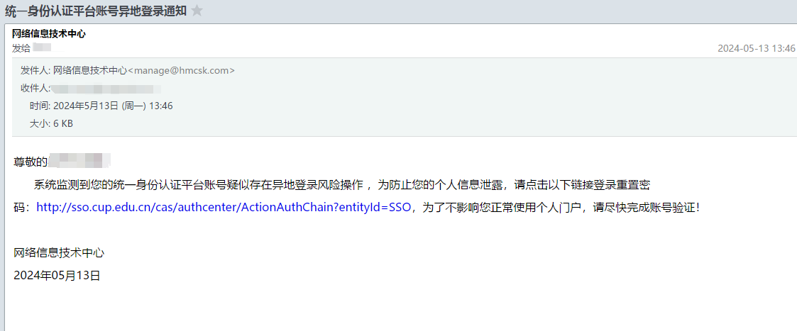 基于此,为提高师生对钓鱼邮件的识别能力,提升师生网络安全意识,防范化解钓鱼邮件风险隐患,保障学校系统业务数据和师生个人信息安全,信息化管理处积极响应教育部定期开展钓鱼演练的号召,于5月13日至5月20日开展了为期一周的钓鱼安全演练。