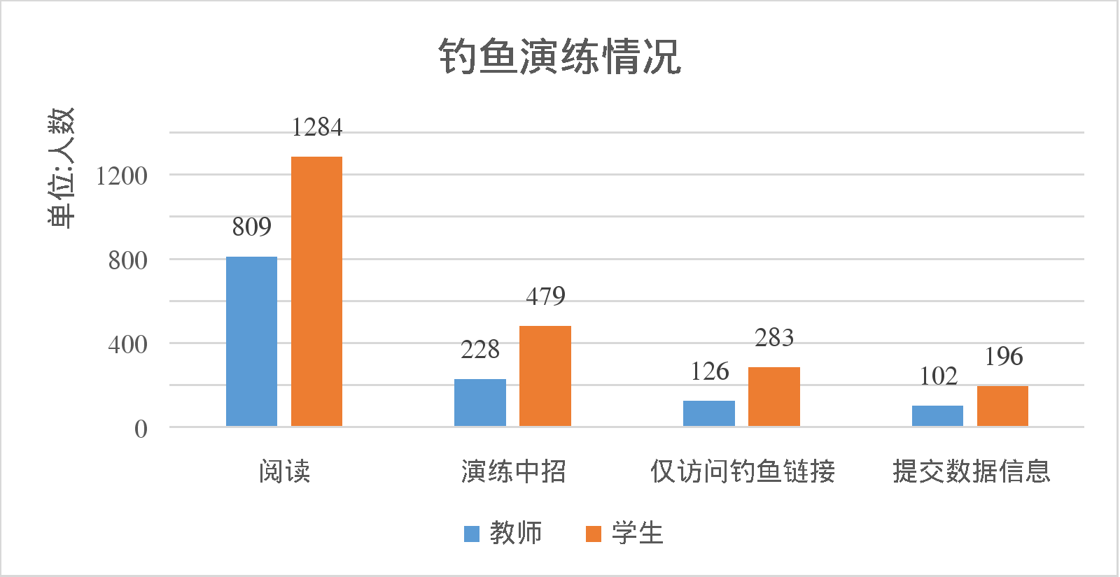 本次钓鱼演练投放样本覆盖全校教职工和学生,发送共计26424封钓鱼邮件(教师:2516,学生:23908),截止到2024年5月20日,一共有707位师生中招,演练情况统计如下: