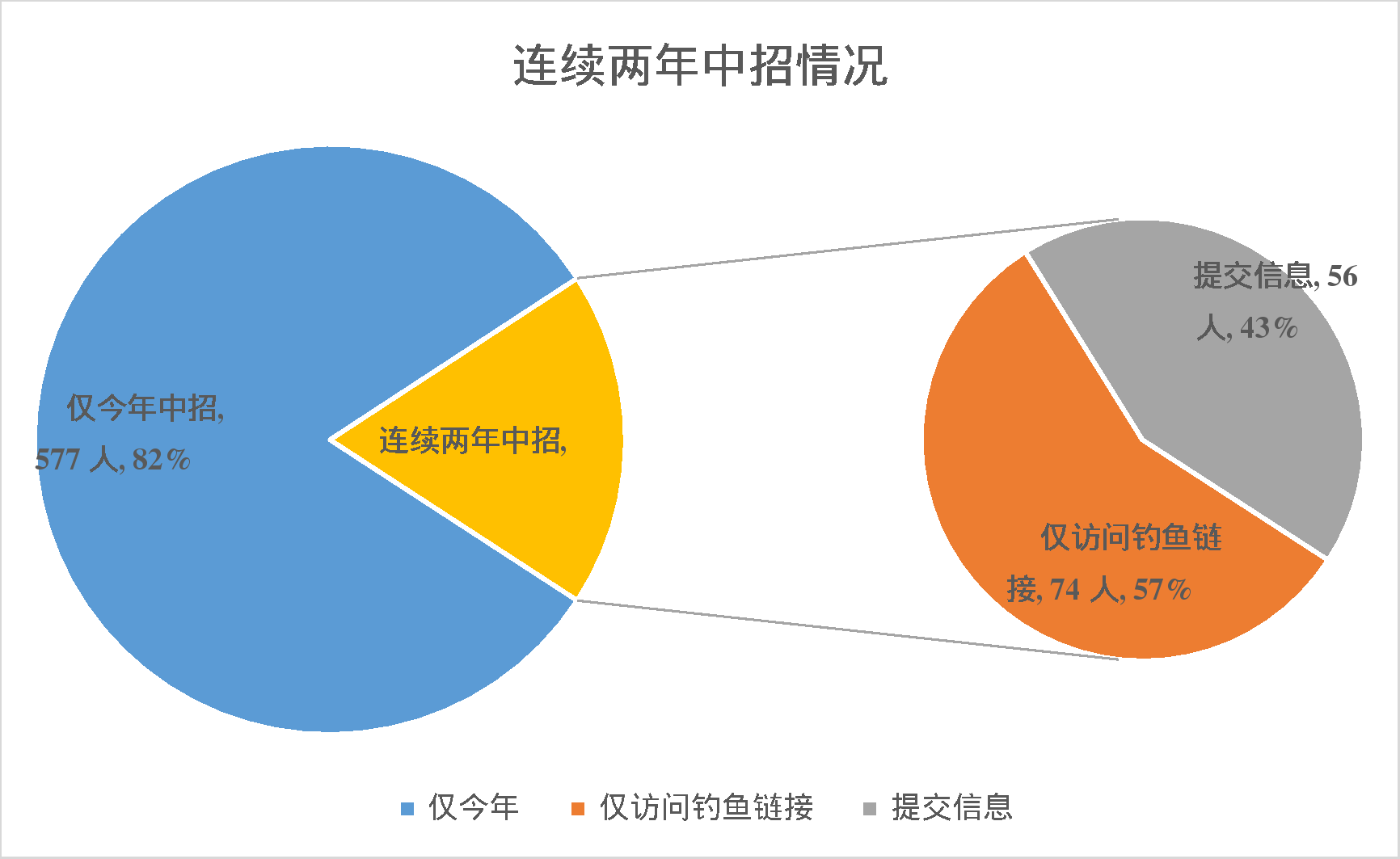 2023年钓鱼演练中共有711位师生中招,2024年共有707位师生中招,相比于2023年略有减少幅度,师生防钓鱼意识有所提高。但从整体情况看,师生安全意识仍然较为薄弱,存在较大安全隐患,其中连续两年中招人数共计有130人,占今年中招的总人数的18.39%。连续两年都中招输入账号密码的人数为56人,访问钓鱼链接的人数为74人。