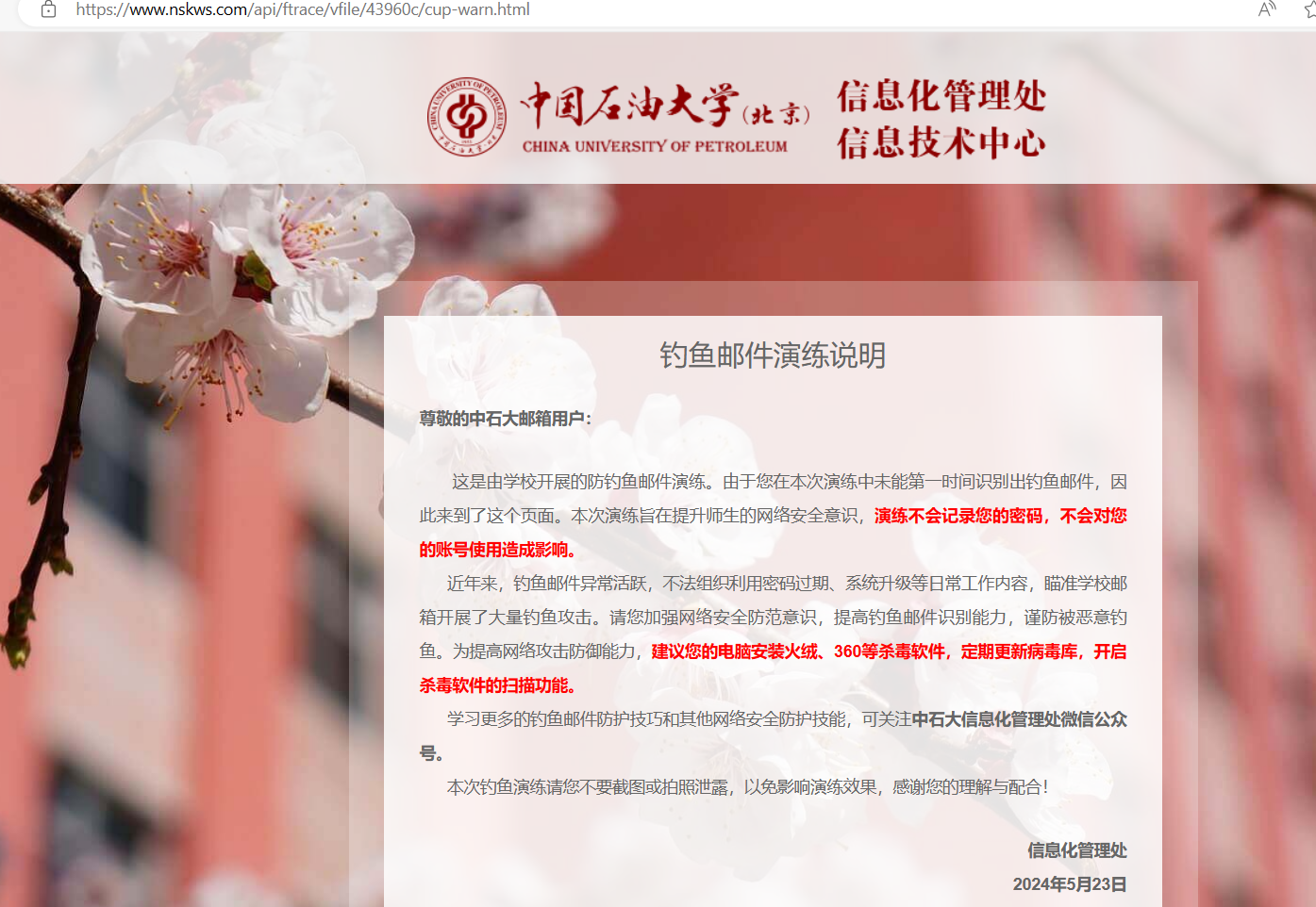 师生输入账号密码后跳转至警示页面,加深演练中招师生印象,方便配合后续的安全意识教育。